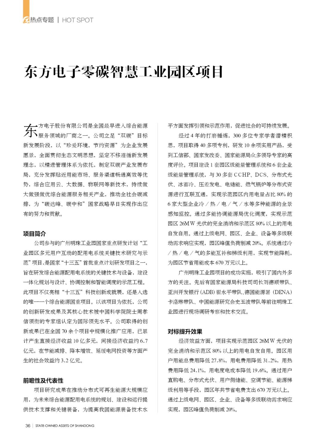 公司参与的广州明珠工业园国家重点研发计划“工业园区多元用户互动的配用电系统关键技术研究与示范”项目,是国家“十三五”首批重点计划研发项目之一,旨在研发综合能源配用电系统的关键技术与设备,建设一体化规划与设计、协调控制和智能调度的示范工程。此项目不仅亮相“十三五”科技创新成就展,还是入选的唯一一个综合能源国重项目。以该项目为依托,公司的创新研发成果及其核心技术被中国科学院院士周孝信领衔的专家组认定为国际领先水平。公司取得的创新成果已在全国70余个项目中规模化推广应用,已累计产生直接经济收益10亿多元,间接经济收益约6.7亿元,在节能减排、降本增效、延缓电网投资等方面产生的社会效益约3.2亿元。