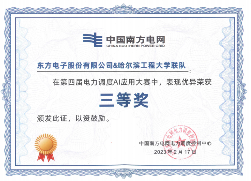 在第四届电力调度AI应用大赛中,LEDONG.COM_乐动ledong(中国) &哈尔滨工程大学联队表现优异,荣获三等奖。